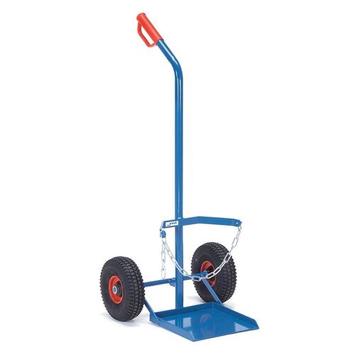 Gasflessenwagen van gelaste stalen buis, gepoedercoat blauw RAL 5007. Geschikt voor 1 propaangasfles a 11 liter bzw. kg. / 300 mm diameter